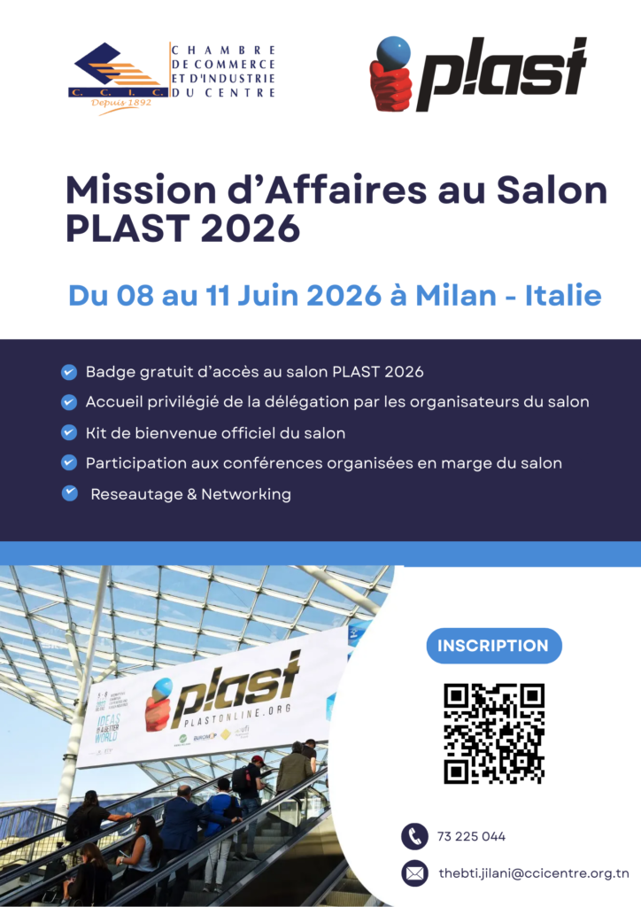 La Chambre de Commerce et d’Industrie du Centre organise une mission d’affaires au Salon PLAST 2026 et ce du 08 au 11 Juin 2026 à Milan (Italie).PLAST 2026, un événement majeur consacré aux technologies de transformation des plastiques et du caoutchouc. Ce salon est le rendez-vous incontournable pour les fabricants, fournisseurs et experts du secteur, souhaitant découvrir les dernières innovations en matière de machines, de matériaux et de solutions durables.