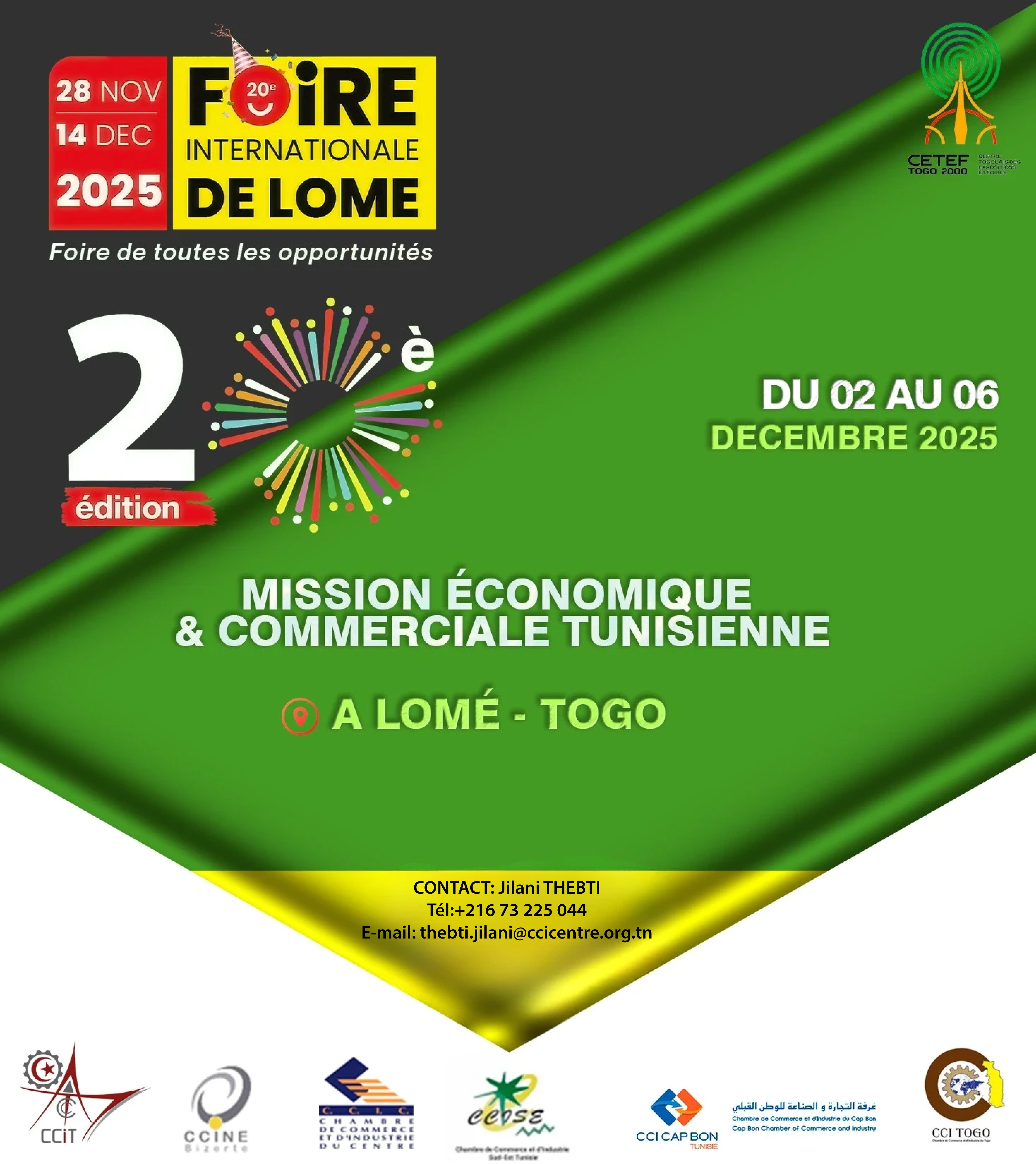 Nous avons le plaisir de vous informer qu’en marge de la tenue de la 20ème édition de la Foire Internationale de Lomé, prévue du 28 novembre au 14 décembre 2025, la Chambre de Commerce et d’Industrie de Tunis organise en collaboration avec ses consœurs les Chambres de Commerce et d’Industrie, du Centre, de Bizerte, du Sud-Est et du Cap-Bonune mission économique et commerciale à Lomé, du 02 au 06 Décembre 2025.