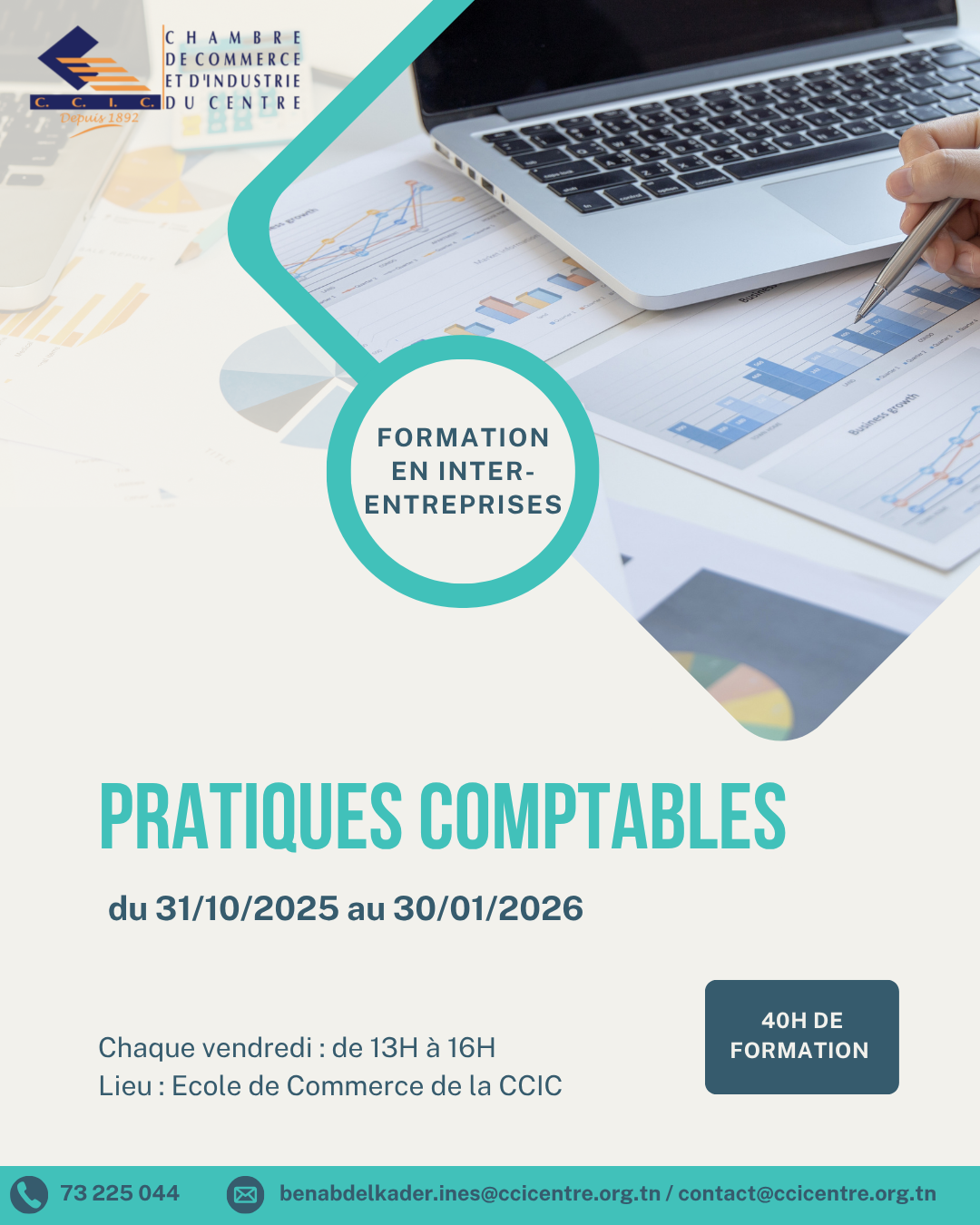 Dans le but de vous familiariser avec le volet pratique de la comptabilité et en vue de renforcer vos connaissances techniques reliées à la gestion de la paie et à la préparation des déclarations fiscales et sociales,la Chambre de Commerce et d’Industrie du Centre vous invite à prendre part au cycle de formation pratique programmé du 31 octobre 2025 au 30 janvier 2026 à Sousse.